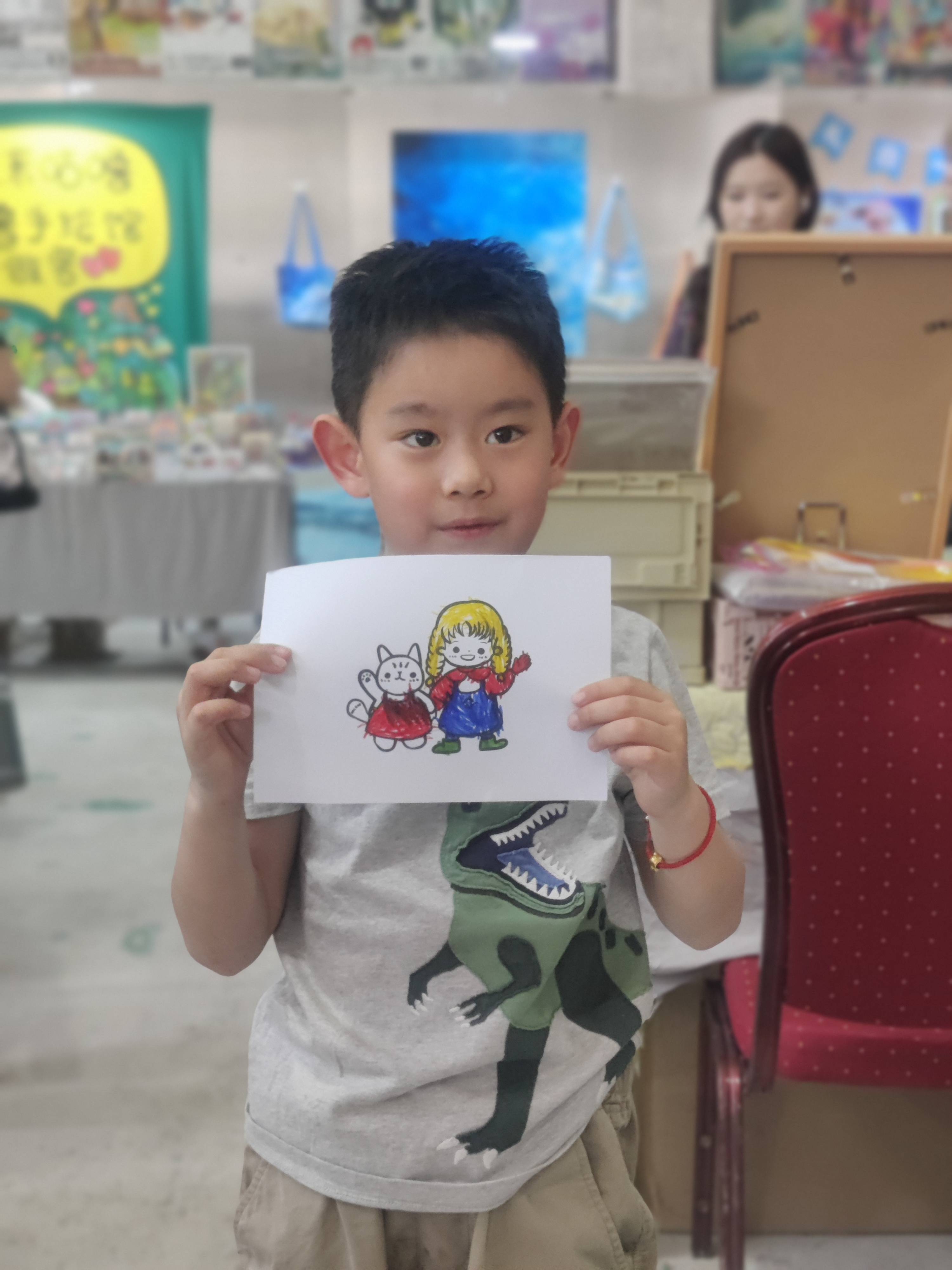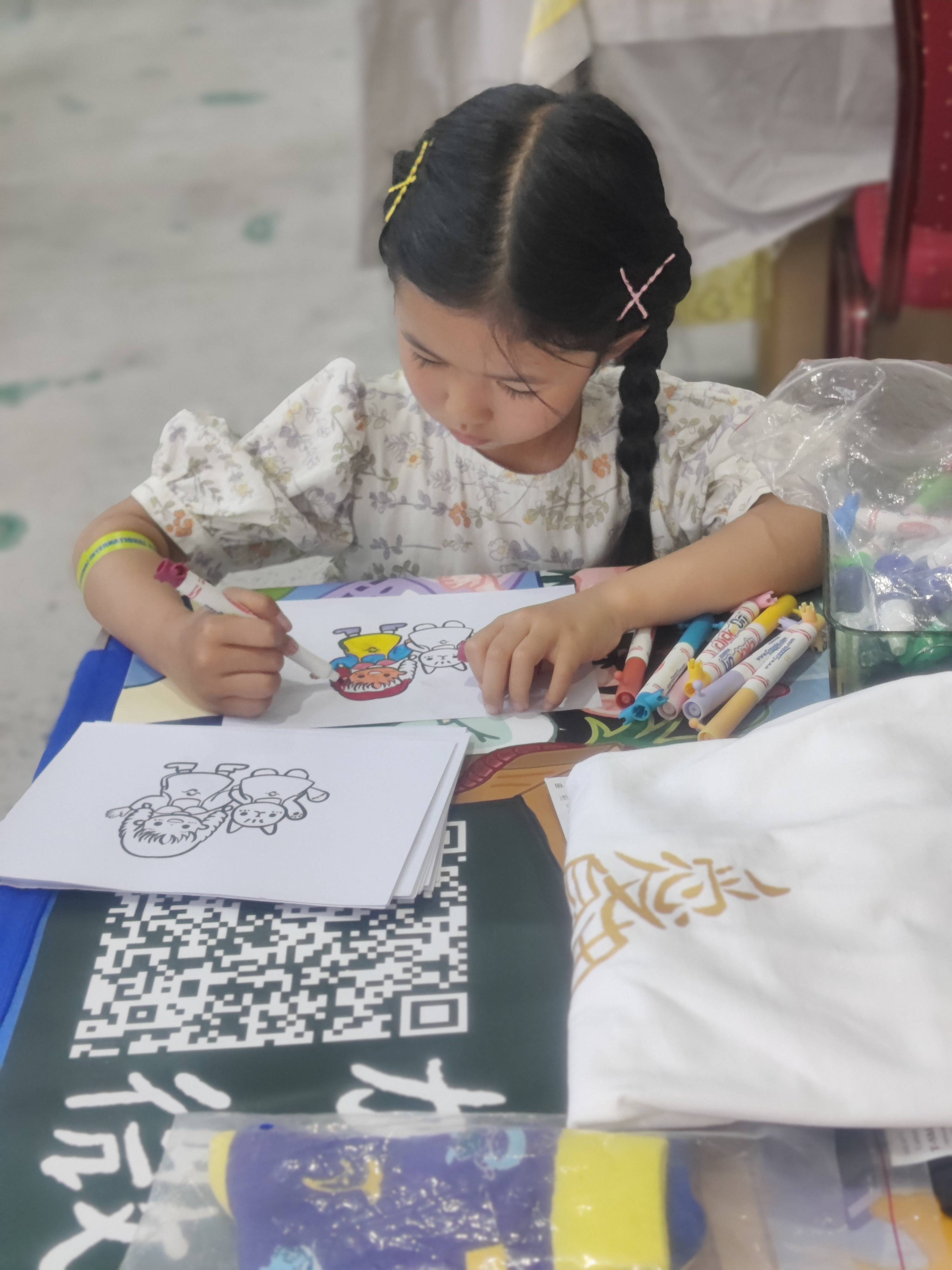 第二天比第一天好很多,主办方拿来好几个大风扇,场馆完全不热了。按照经验,一般周六买东西的人比较多,周日本地散客多,可以招募志愿者。果然如此。上午志愿者分别带了三个孩子过来。孩子会相互吸引,结果画画的人远超周六,画画的纸都画完了。咱们的小志愿者还出去推销了一下。下午有志愿者带来超级漂亮的扇子,吸引了好几个人来画画。感觉自己还是高估了自己的体力,下午五点我又开始游离了,所以干脆早点回家了。